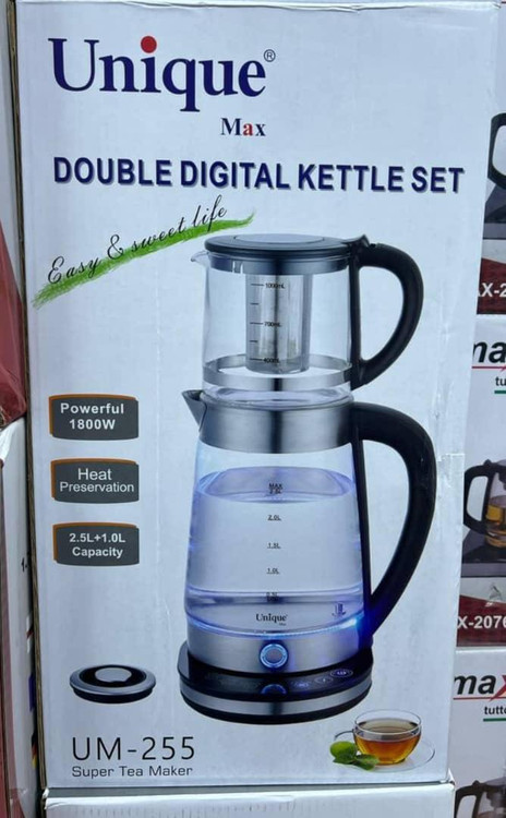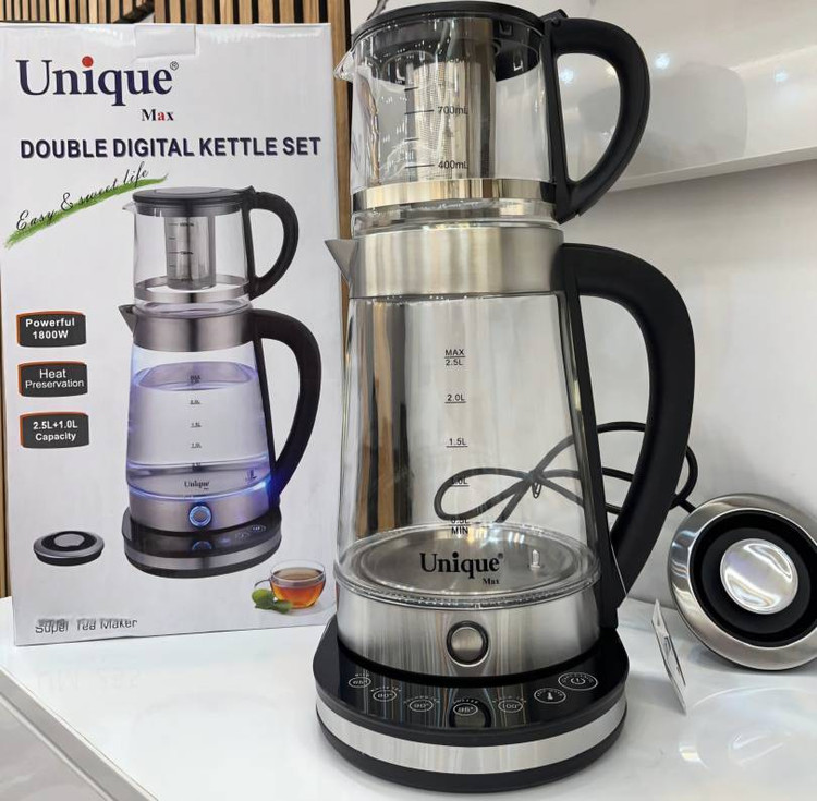 چایساز لمسی یونیک UM-255 با کتری 2.5 لیتری و قوری 1 لیتری از جنس پیرکس، توان 1800 وات و فیلتر استیل ضد زنگ، مناسب برای تهیه سریع و آسان چای در خانه و محل کار است.