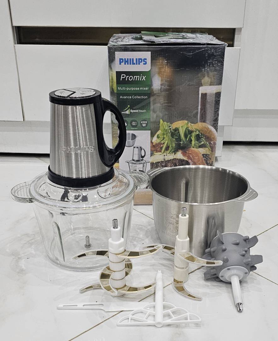 خردکن فیلیپس دو کاسه 4.5 لیتر شش تیغ + 4 تیغ تیتانیوم موتور حک شده با سیرپوست کن و همزن مدل 2020